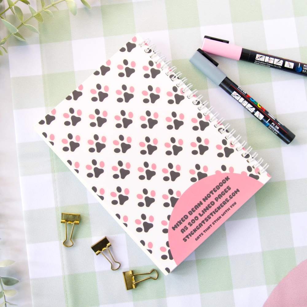 This adorable A5 Cat Paw Notebook features a playful cover filled with colorful cat paw prints and mixed toe beans based on the cat Balthazar’s toe beans. Whether you’re jotting down notes, journaling your thoughts, or sketching your next big idea, this notebook adds a touch of cuteness to every idea.
